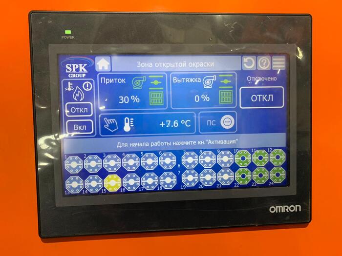 Мы всё ещё помним, что цель зоны открытой окраски — экономия ресурсов. Потому и сопла запускаются не все сразу, а только над тем местом, где планирует работать маляр — он сам запускает вентиляцию над зоной окраски. Сделать это можно на специальном пульте, прикладываем его фото ниже: