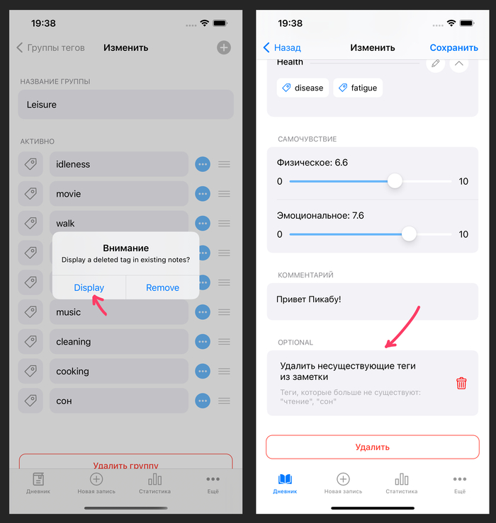Но что делать, если пользователь удалит все группы тегов? Что он увидит на экране новой заметки на месте раздела тегов для этого случая? Что делать, если пользователь удалит все теги в определенной группе? А что, если пользователь удалит теги, которые уже использовались в заметках в дневнике? А что если потом он захочет отредактировать эти старые заметки с несуществующими тегами?