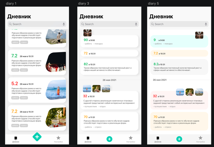 Как постепенно менялось видение дневника (скрин из программы Sketch). В итоге от фичи с прикреплениям картинок пришлось отказаться.