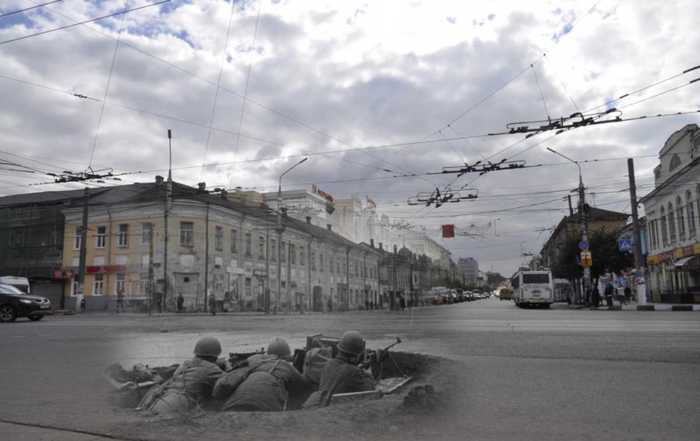 Тула. Советские бойцы в окопе на перекрестке ул.Коммунаров (совр. пр.Ленина) и Советской улицы