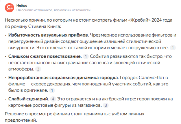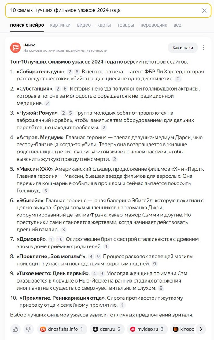 Начал я со сбора данных. Вот что выдал мне Поиск с Нейро на запрос «топ 10 самых страшных фильмов ужасов 2024 года»: