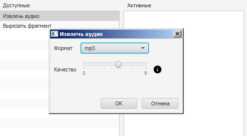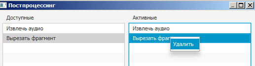 Постпроцессинг в настоящее время имеет 2 опции - Извлечь аудио и Вырезать фрагмент. Чтобы выбрать опцию кликайте на ней 2 раза мышью.