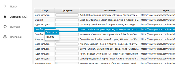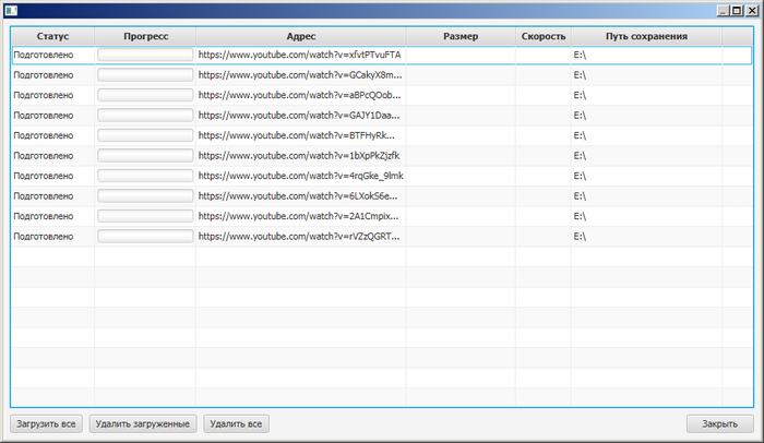 Открывается через меню Файл -> Очередь загрузок. Можно стартануть как отдельные закачки (кликнув на них правой кнопкой мыши), так и все разом. Поддерживается многопоточная загрузка, но количество потоков ограничено числом ядер вашего процессора + 1. Если стартанули сразу много роликов, то часть из них начнет загружаться, остальные будут поставлены в ожидание и начнут загрузку как только появится свободный поток. Ограничил, чтобы число потоков не выкручивалось до небес, тем самым делая только хуже. В будущем, если будет необходимо, сделаю этот параметр настраиваемым с какими-то разумными ограничениями.