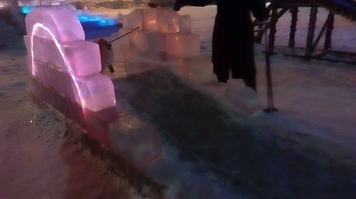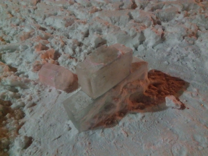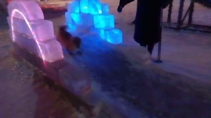 Да, это просто столбики и кубики льда. Помнится, я подобную ерунду в Майнкрафте строила. Положили, и хватит. На этом стены закончились. Есть еще мини–горка, тоже деревянная, не залитая. Есть еще Горочка с собакой игирляндамиво льду. Единственное нормальное сооружение. (И ту, и ту, видно на фото выше). И гвоздь программы — шедевр 30 см в высоту, хоть и красивый, но бесполезный. Отлично подошел нашей собаке