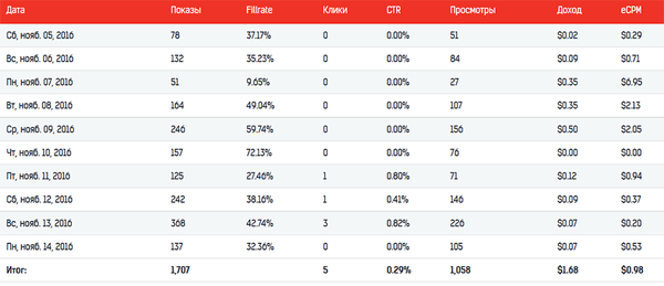 Сеть которую я выбрал для монетизации я называть не буду, так как вроде тут нельзя напрямую называть компании и сайты, чтоб не посчитали за рекламу, но статистика выглядела весьма странно и я не совсем понимаю до сих пор, почему такой маленький филлрейт, но в поддержке сказали что у меня маленький трафик и нормальная настройка сетей начинается от 5000-10000 показов рекламы ежедневно.