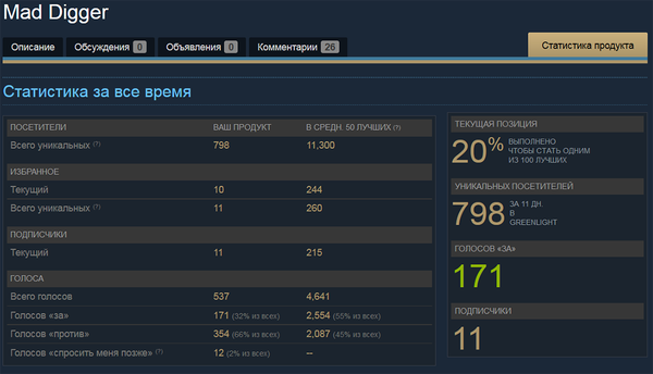 Зайдя в зону Гринлайта и заполнив все необходимые поля (название игры, жанр, скриншоты к игре и видео) моя игра сразу же появилась в новиках Гринлайта и стала доступна для оценок. Большой ошибкой было пренебрежительно отнестись к созданию видео, потому как видео играет основную роль влияующую на оценку основной массы пользователей. Но с видео-редакторами у меня особо опыта работы и я сделал очен плохое по качеству видео, мало того когда я заливал его на ютую - почему-то менялись цвета на очень блёклые и пришлось менять контрастность средствами того же ютуба. Оценок "За" было всего лишь около 20% из всех проголосовавших, остальные были "против".