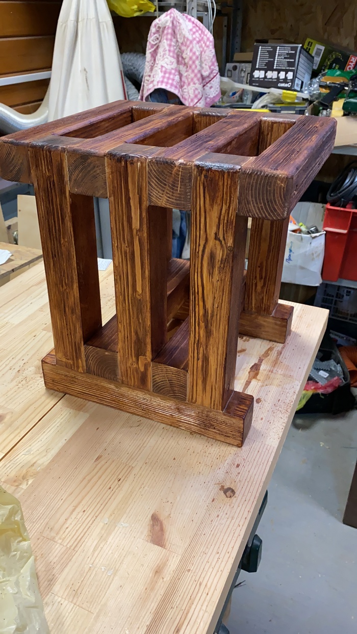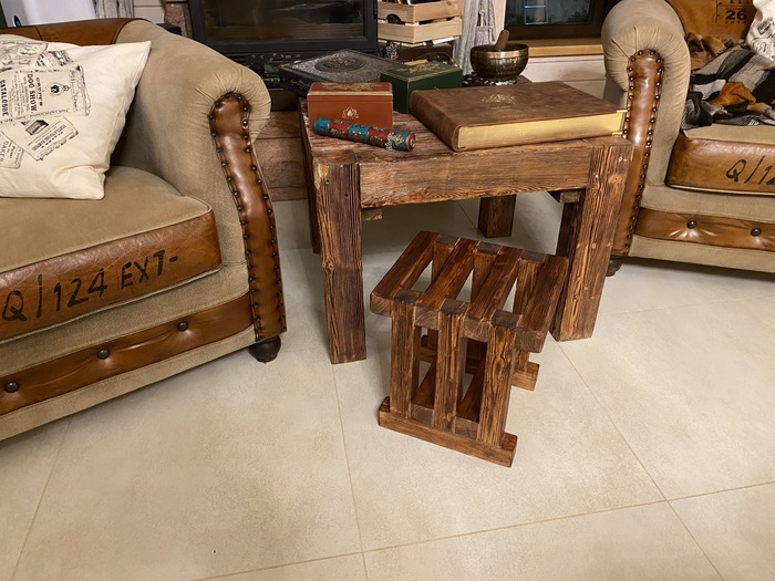 Увидел пост и тут же пошел и запилил такую же табуреточку, благо брусок 5х5 валялся свободный. Его потребовалось 4.6 метра. Хотя казалось бы - куда столько?! Края обработал кромочным фрезером, чтобы при переноске руки не резало. :) Покрытие - морилка дуб. Стоимость 200р бутылка :) Стол тоже моего производства :)