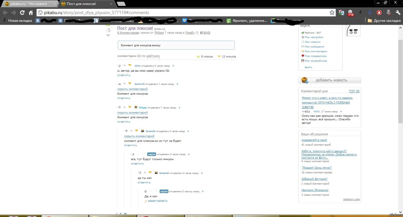 segline 13 лет назад Пикабу такое пикабу Ну что ж, раз никто до сих пор не разместил, буду первым, по мотивам поста: http://pikabu.ru/story/post_dlya_plyusov_577119 [моё] Картинки и фото