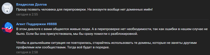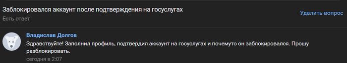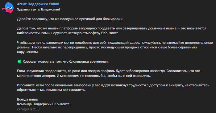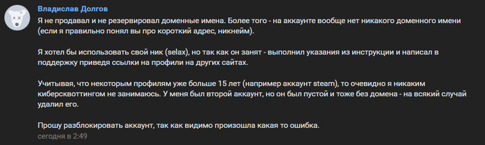 Так вот - полностью заполнил один из профилей реальными данными, добавил фото, даже подтвердил данные через госуслуги. В профиле наткнулся на сообщение, что если хочу занятый короткий адрес неактивного пользователя, то нужно написать в поддержку через специальную форму. Сама форма это 2 вопроса от бота поддержки в чате - ссылка на желаемый адрес и ссылки на профили других сайтов подтверждающие, что давно пользуюсь данным ником. Собственно всё заполнил, прикрепил кучу ссылок (в том числе с аккаунтами, которым уже больше 15 лет), появилось сообщение что сообщение передано агентам поддержки. Проходит несколько часов и.... аккаунт улетает в бан на 2 недели.