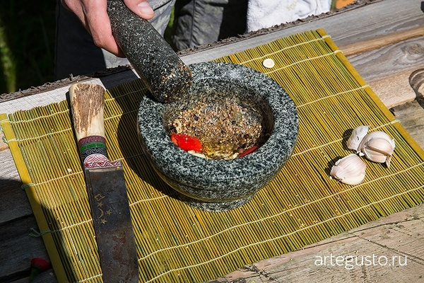 Тесто: для этого разминаем с мукой холодное сливочное масло, затем добавляем туда же творог, щепотку соли и разрыхлитель. Тщательно смешиваем все ингредиенты, после чего ставим тесто в холодильник на 20 минут.