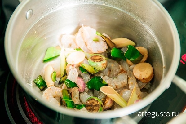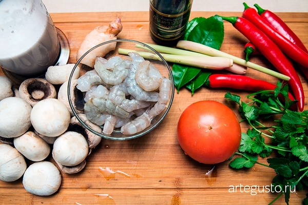 Название «том-ям» состоит из двух слов: «том» - варить, кипятить и «ям» - острый тайский салат. Именно такое сочетание и дает тот несравненный кисло-острый вкус, благодаря которому тайский суп популярен во всем мире. Для его приготовления необходимо заранее сварить куриный бульон. Очищаем креветки от панциря, разрезаем вдоль спинку, вынимаем кишку и хорошенько промываем. Шампиньоны нарезаем мелкими ломтиками.
