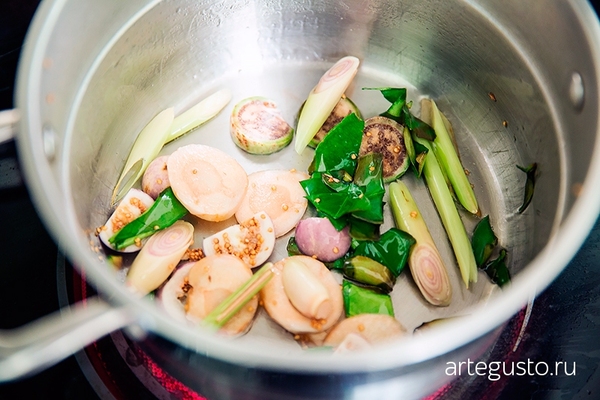 Имбирь нарезаем ломтиками, стебель лемонграсса разделяем на 3-4 части, листья лайма - на несколько частей (по желанию). Разогреваем кастрюлю, наливаем туда растительное масло и обжариваем все выше перечисленные ингредиенты в течение 3-4 минут при интенсивном помешивании. Таким образом эти пряности лучше раскроют свои ароматы.