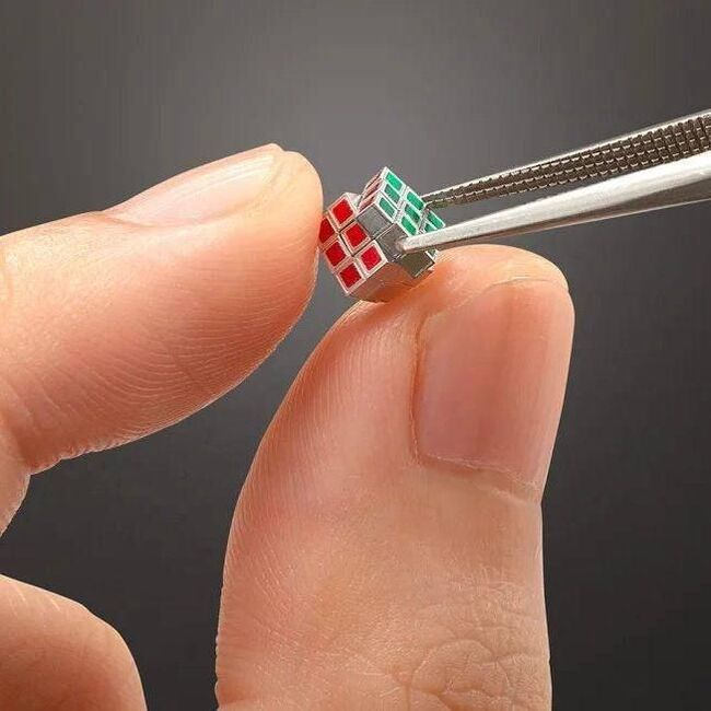 В Японии создали самый маленький кубик Рубика в мире. Его стороны — около 5 мм, а площадь квадрата — 1,6 кв. мм. Микрокубик сделан из алюминия и весит всего 0,3 г.