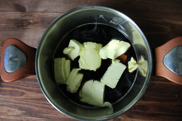 Открываем пиво. Перед тем, как начнем его пить, выливаем нужное количество в сотейник, добавляем слив.масло, ставим на средний огонь. Ждем, пока пиво не нагреется и не начнет таять масло.