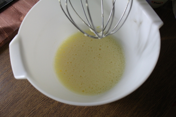 Берем яйца. Куриные. С остальными не экспериментировала. Взбиваем миксером, пока не превратятся они в светло-желтую пенную массу, добавляем сметану, перемешиваем.