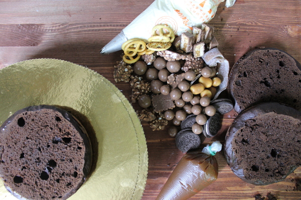 В финале расписываться ну буду. Просто кратко : с коржей срезаем "горбы", кладем на подложку. Слой крема, орехи, карамель, снова корж, крем, орехи, карамель, корж, крем и... и дальше гуляй фантазия! )
