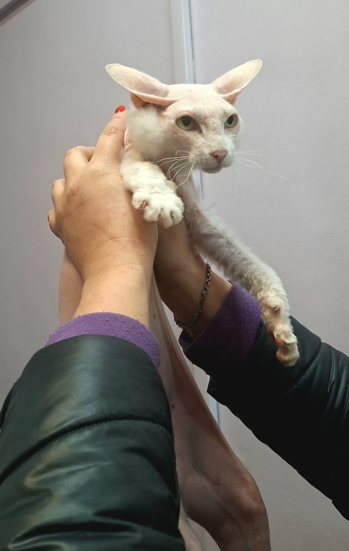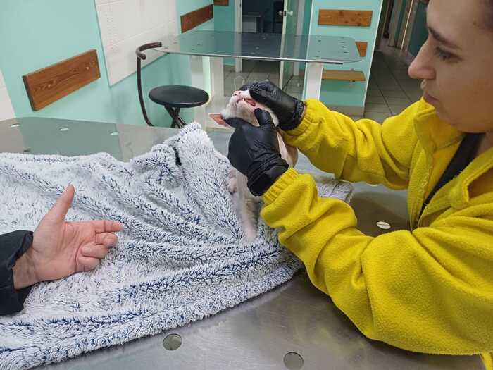 Доставили в клинику: истощенная вес 1800 граммов, грязная и все тельце в шрамах ( шрамы по всему туловищу спиралью-т.е как будто кошка застряла где то в колючей проволоке)