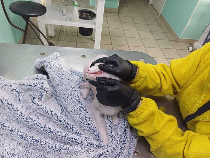 отсутствуют верхние клыки, кровотечение обломки на верхней челюсти. Требуется удаление Ушной клещ.