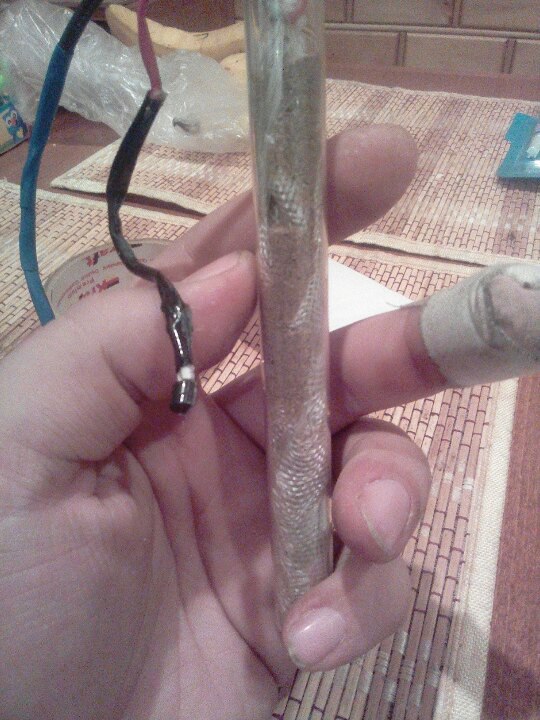 В емкость врезан нагреватель из пробирки и нихромовой спирали, замотанной в стеклоткань (чтоб нагреватель не касался стенок пробирки (локальные перегревы стекла - разрушение)) и трубочка с отверстиями для продувки.