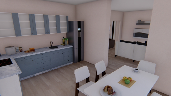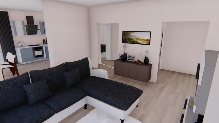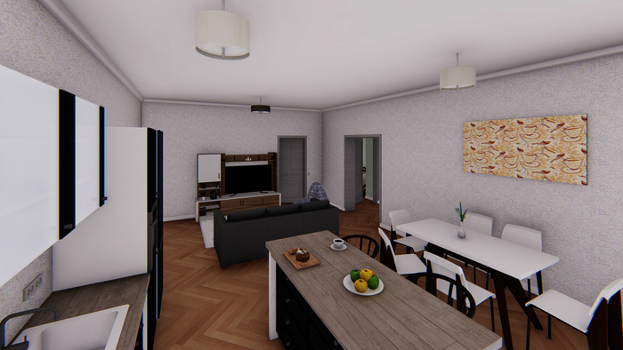 Вопрос отопления решается за счет котла, который устанавливается на кухне. В случае газового котла от вас потребуется установка дверей в гостиную (проем слева на фото выше).