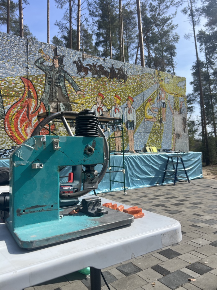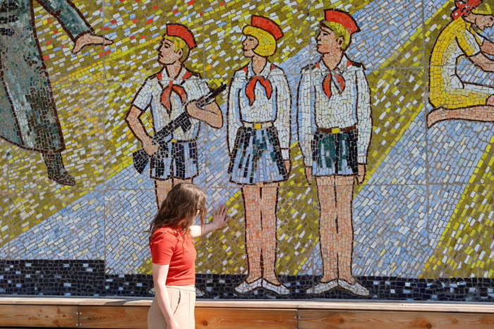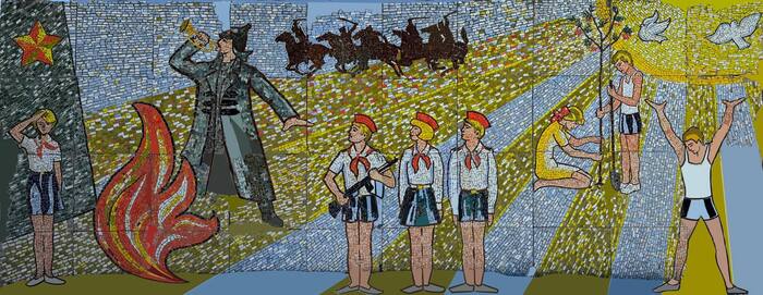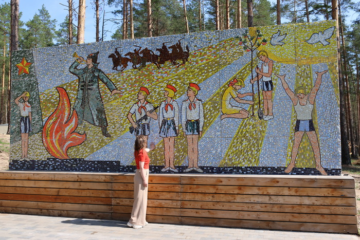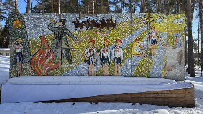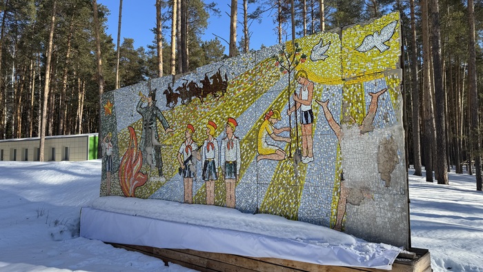 Совсем недавно отреставрировали мозаику СССР из смальты в детском лагере в Татарстане. Изначально мозаичное панно выглядело так: