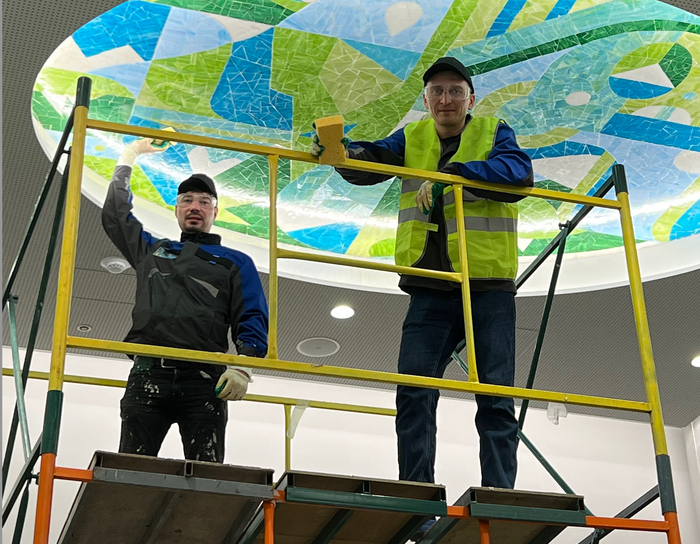 Дело было в марте 2023 года. Обратились к нам в мастерскую мозаики с одним интересным проектом, а именно сделать 5 овальных мозаичных панно (около 40 м2) из витражного стекла + монтаж на потолок в аэропорту города Новосибирск. Так-то проект не сложный, но как всегда срок был "вчера", а точнее 1 месяц на всё. Не долго подумав (не было времени думать), я согласился взяться за этот проект.