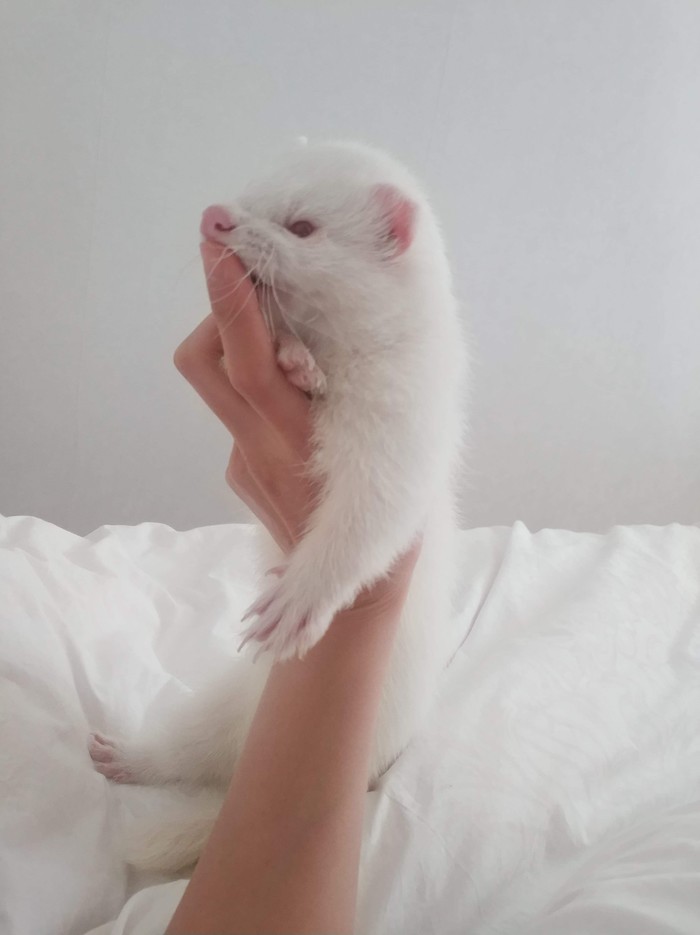 Хорька выбирали пару дней, я хотел бежевенького и поэтому взяли 4-х месячного альбиноса. Клетка подошла идеально, в гамаке спит с удовольствием. В первый же день зацепился когтем за гамак и подвесился на нем. Орал на всю квартиру. Дважды меня укусил, пока я его снимал. Больше не цеплялся. Зато кусал.