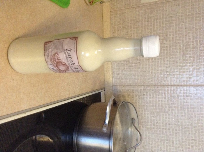 Поскольку с дивной жидкостью в бутылке я имел дело впервые, то некоторые ее свойства стали для меня открытием. Рецепт предписывал хорошенько взболтать содержимое. И действительно, после взбалтывания цвет жидкости поменялся с «сывороточного» на белый (сравните картинки). Однако… кто ж знал, что открывать надо аккуратно? После такой встряски будущий журек ринулся на волю при малейшем повороте герметичной крышки. Короче говоря, наш протожурек повел себя, как последняя газировка. В конце концов, недостаток кулинарного опыта был возмещен каким-никаким жизненным и утечка ликвидирована.