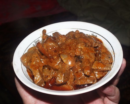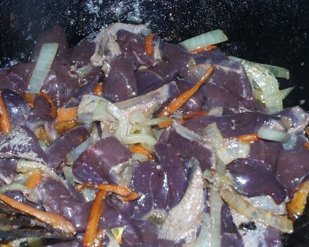 После того, как нужный оттенок был достигнут, содержимое сковороды было отправлено в кастрюлю с бульоном, где провело 30-35 минут на медленном огне.