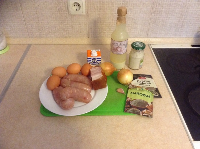 четыре белых колбаски (вместо белых взял куриные и это единственное, о чем пожалел — куриные оказались суховаты);
