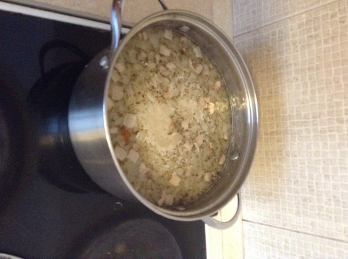 Когда бульон готов, на арену вышла грудинка. Она была порезана кубиками и отправлена на сковороду. После того, как с нее начал вытапливаться жир, туда же последовал и лук. На скороде они в органичном союзе провели некоторое время, пока не приобрели слегка золотистый цвет. Как вы понимаете, искусство не терпит формальных рамок и время я не засекал. Кстати, настолько увлекся процессом, что забыл зафиксировать этот этап для потомков.