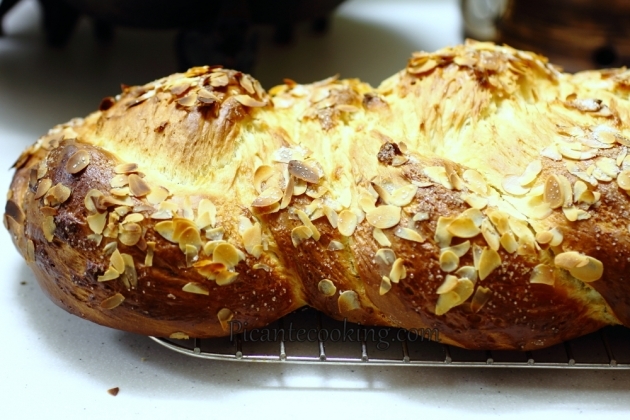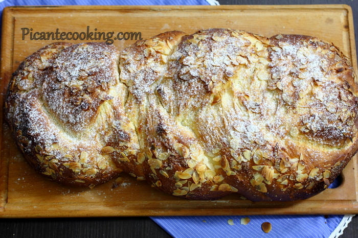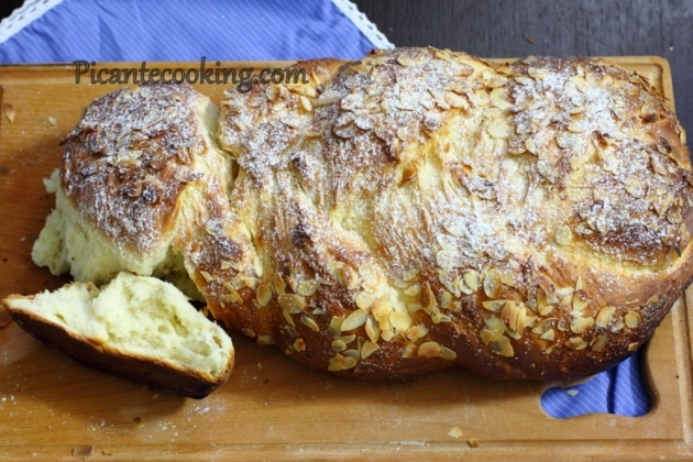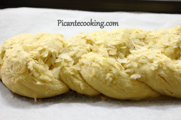 Смазываем пуллу оставшимся яйцом, посыпаем миндалем и сахаром.