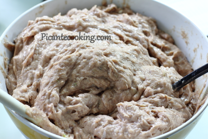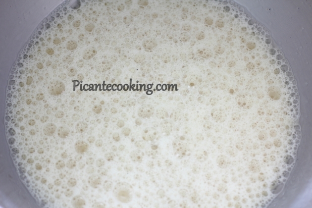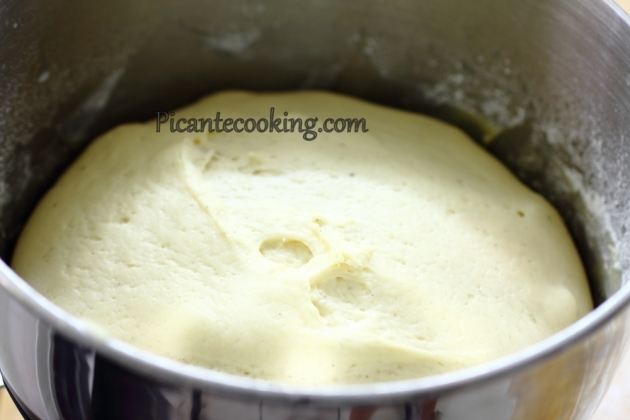 Тонкой струйкой всыпаем муку в молочно-яичную массу, постоянно мешая, замешивая мягкое, эластичное тесто, добавив туда после муки масло. Месим тесто до тех пор, пока оно перестанет липнуть к руками 8-10 минут вручную, 3-4 минуты планетарным миксером.