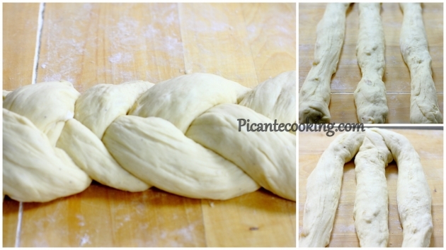 Разделяем тесто на 3 части. Скатываем из каждой полоску длиной около 50 см. Выкладываем полоски параллельно и скрепляем их концы с одной стороны. Плетем из полосок косичку, сжимая концы с другой стороны. Подворачиваем их слегка в середину.