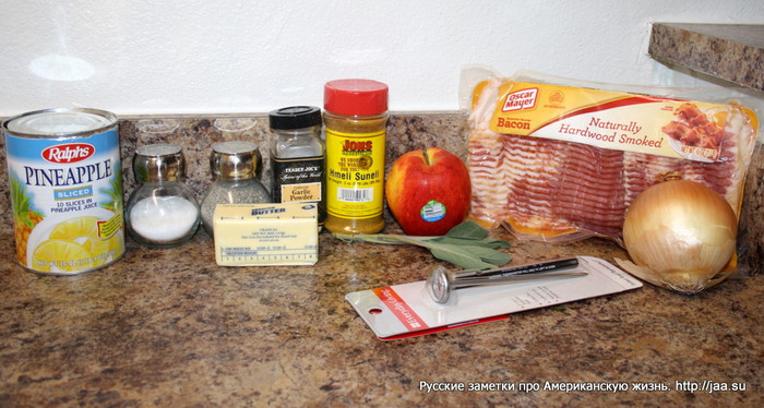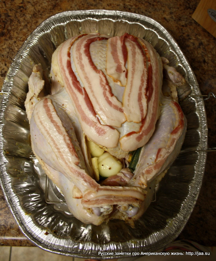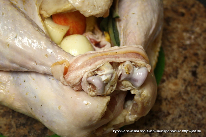 Под конец приготовления индейка отклячила одну ножку в сторону, порвав полоску бекона, но мы связали ножки простой ниткой. Птичка больше пируэтов не вытворяла.