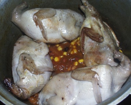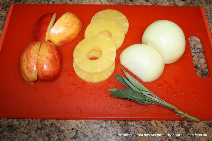 Слив воду и еще раз промыв, нашла внутри птичкину шею! Т.к. готовила ее первые раз — это оказалось сюрпризом. Внутри посолила, поперчила, насыпала немного специй и набила ее заранее приготовленной луковицей, порезанным яблоком и колечками маринованного ананаса.