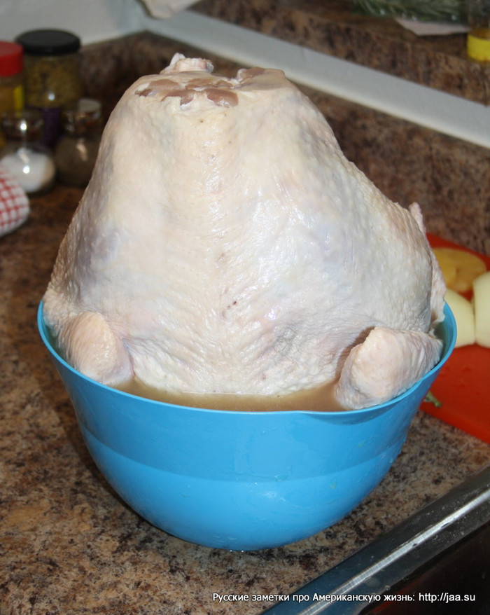 Маринад я сделала из «сборной солянки» сложив все прочитанные рецепты в один: апельсиновый сок, сок от консервированных ананасов и подсоленная вода. Соки смешала и налила во внутрь птицы, сидела же она в воде. Замочила я ей только попу, потому что такой огромной тары, чтобы поместить ее всю, у меня не было. Сверху накрыла второй миской и завернула все в пакет. Ночь индейка просидела в холодильнике.