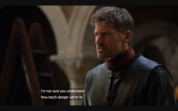 Во время просмотра я заметил кое-что в этой сцене между Арьей и людьми Ланнистеров. Первое, самое очевидное, нам показывают, что Арья понимает, что есть хорошие люди по обе стороны войны. Второе, менее прозаичное, что у Ланнистеров мало сил, и они сражаются, и на всё это указывает голос разума Ланнистеров, Джейме.