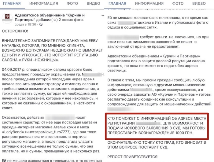 Только заблюрил все я, а эти... уникумы, просто взяли скриншоты из социальных сетей своей клиентки и разместили вот такую красноречивую надпись (разместили у себя, где 75 тысяч подписчиков). И когда в фейсбуке, например, идет любой негатив о них (а негатив, поверьте, уже достаточно много, потому что нашлись и другие люди, которые пострадали от их профессионализма), то они спамят вот такими фотографиями с личными данными человека.