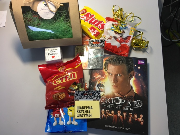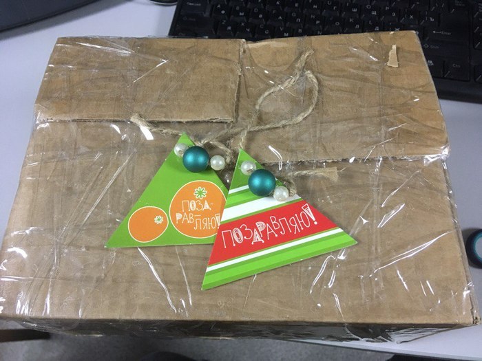 И вот, приехав на работу, открываю пакет, и что я там вижу - коробочка, укутанная в скотч сильнее, чем хаджит в горах Джерол, а на ней мимимишечные открыточки с поздравлениями!