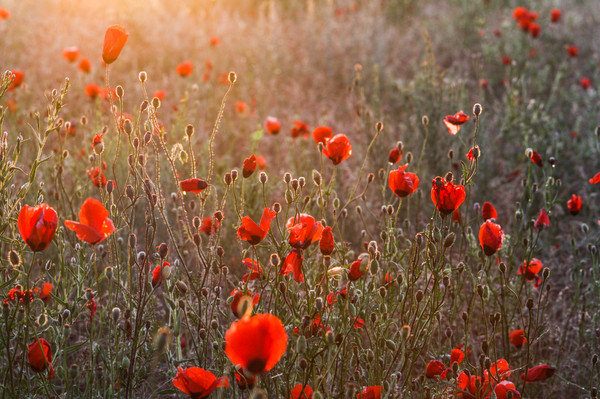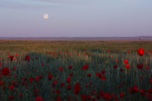А дальше... Дальше начались поля цветущих маков! Мы уже совершенно не торопились и тихонечко плелись по трассе, что-то обсуждая. И тут начали появляться первые, сначала редкие участки с алыми мелкими цветами на сухой почве. Представьте себе наши восторги. Все неприятные впечатления от общения с ДПС просто смыло. У Стаса давненько была мечта увидеть такое своими глазами, он даже подумывал о путешествии в Афганистан в период их цветения, я вообще не представляла, что это такое. Поэтому и в Казахстан мы поторопились попасть до наступления лета, чтобы был шанс увидеть цветущие поля. А тут вот пожалуйста. И чем южнее мы продвигались, тем сильнее алело все вокруг. А к вечеру на горизонте появился Тянь-Шань...