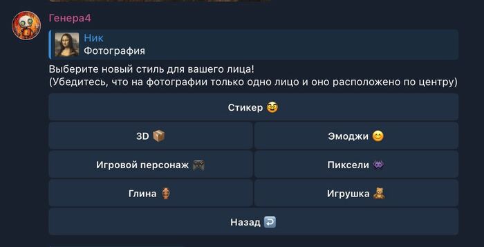 в предыдущем посте рассказал про новую функцию бота Генерач с созданием стикеров из своего лица. Она всем очень понравилась, так что я работал все выходные и сегодня рад поделиться ещё 6-ю новыми стилями для ваших фотографий!