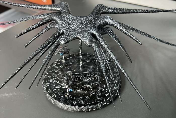 Весь процесс изготовления, раскрашивания и доставки занял примерно три недели. Модель изготавливается с помощью триД печати, а раскрашивается уже вручную (ну по крайней мере мне так показалось). Учитывая сложность рисунка поверхности в принципе – для меня это уже многое говорит. Размах крыльев – 24 см. Высота с подставкой 9 см. В качестве подарка мне досталось три истребителя теней.