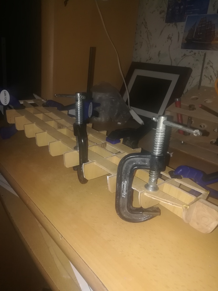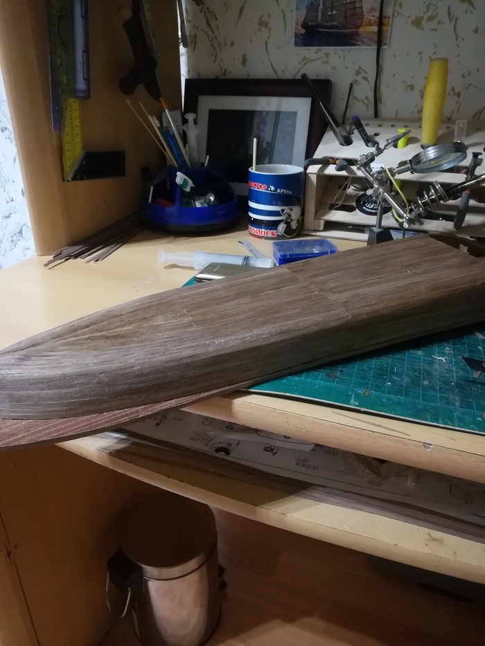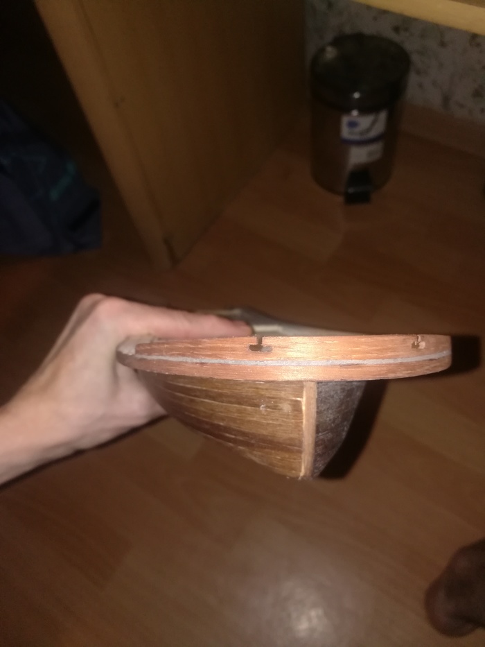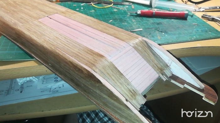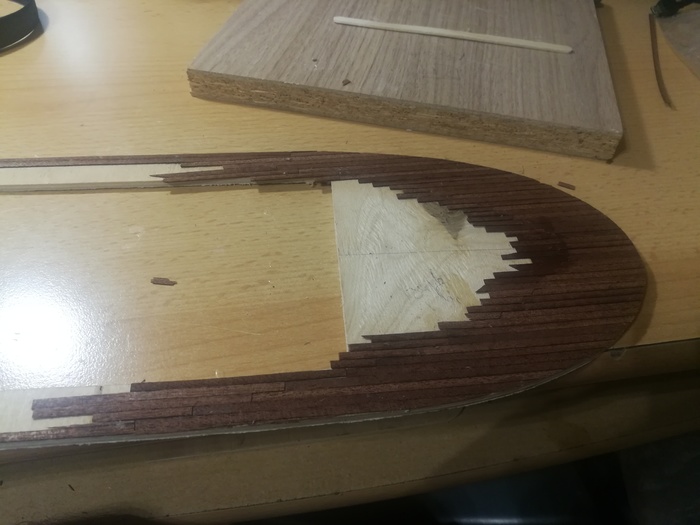В качестве чистовой обшивки использовал шпон ореха.обратная сторона палубы обшита остатками реек от китайского набора голландской яхты