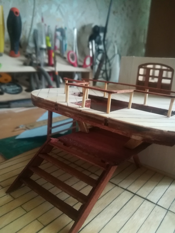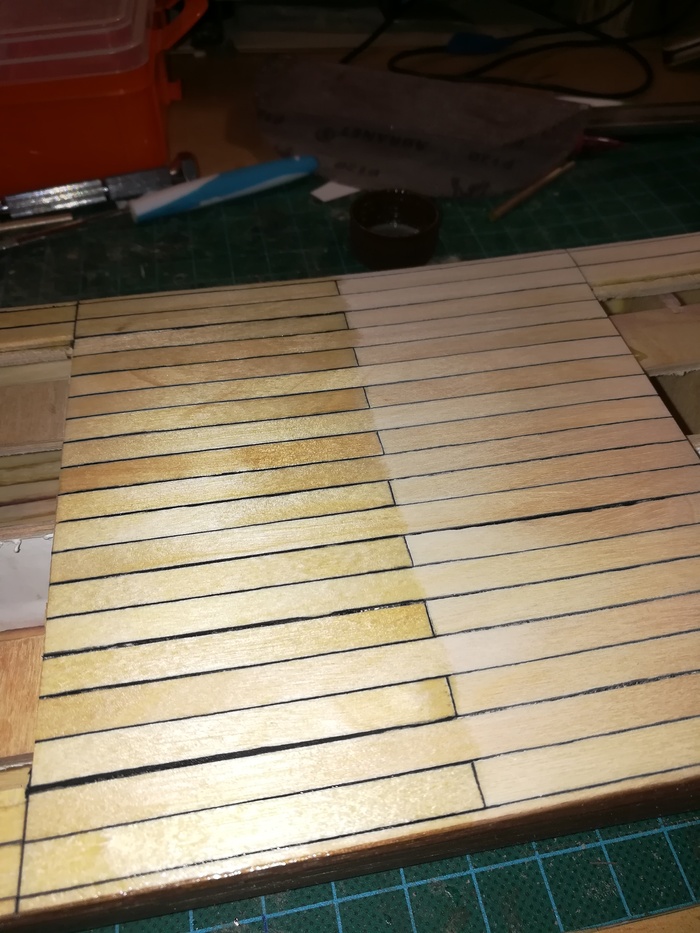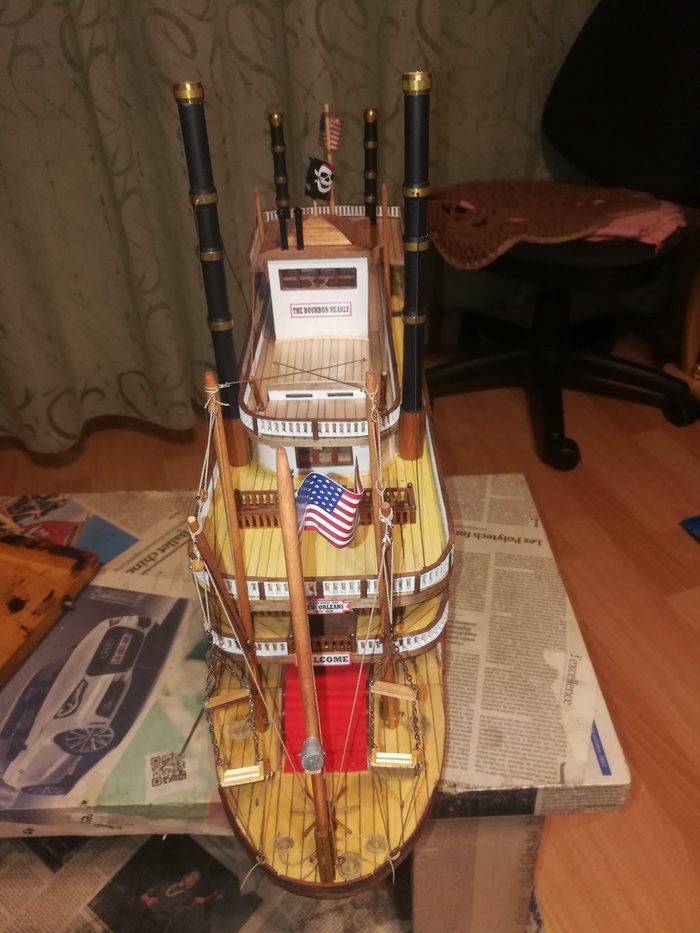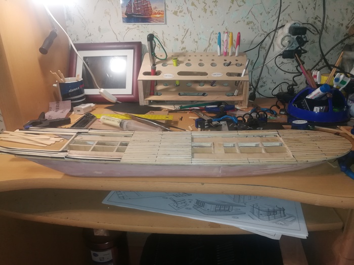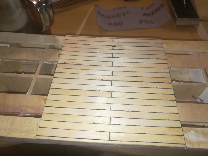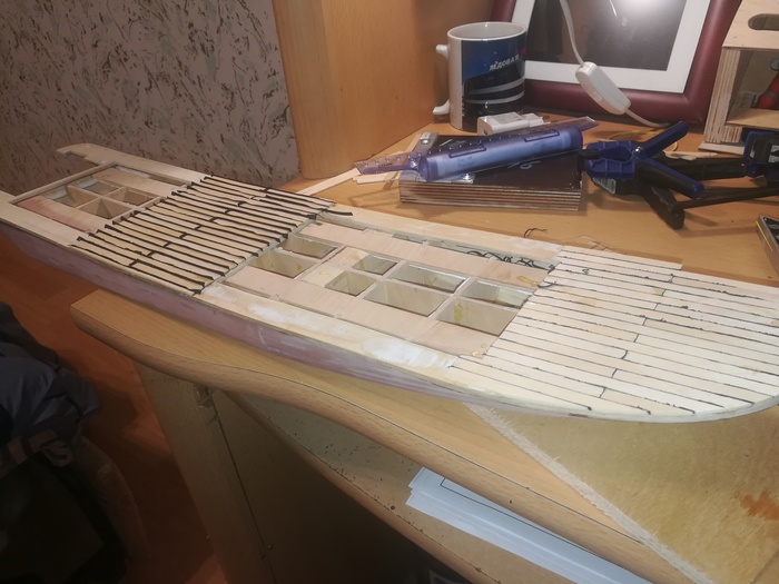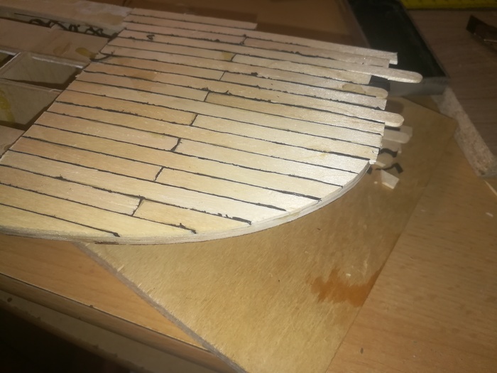 Параллельно делал нижнею палубу,для неё застилания использовал палочки для кофе,а для выделения швов черную бумагу,на двух палубах других из трёх будет использоваться другая технология.