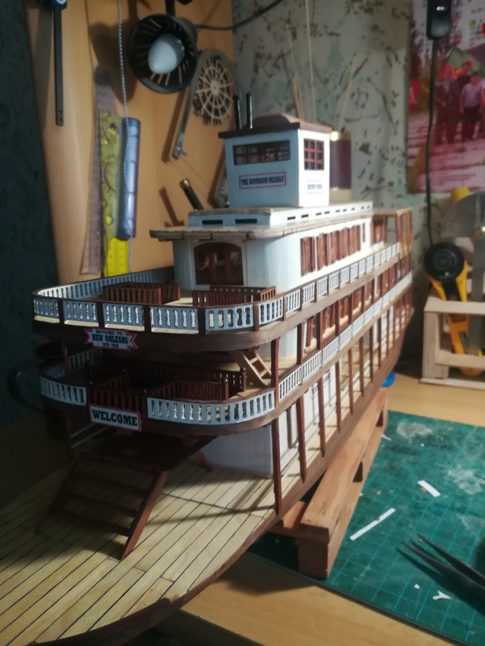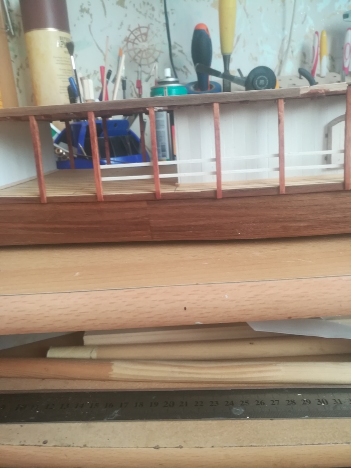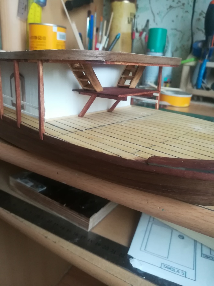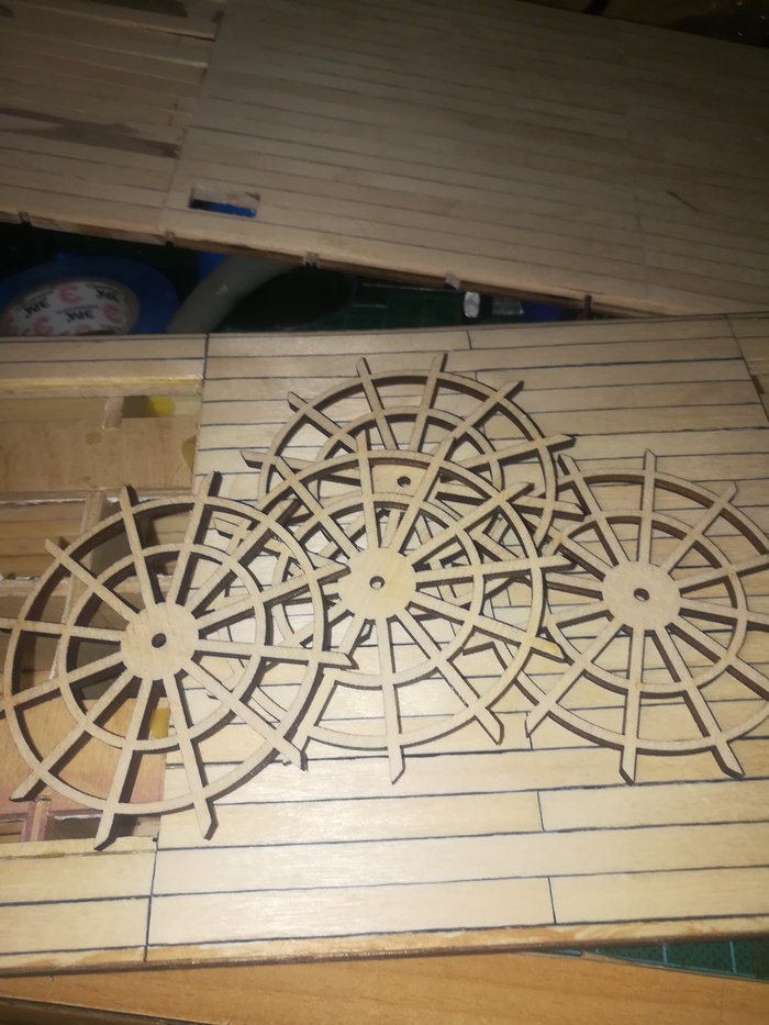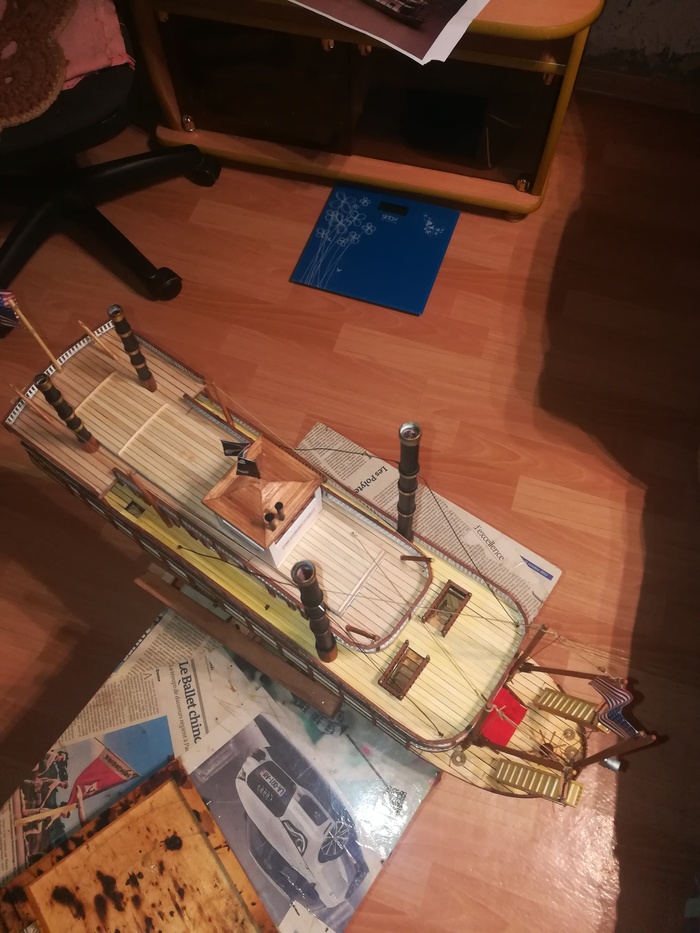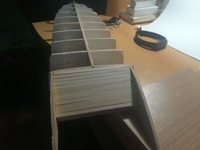 Параллельно делал нижнею палубу,для неё застилания использовал палочки для кофе,а для выделения швов черную бумагу,на двух палубах других из трёх будет использоваться другая технология.