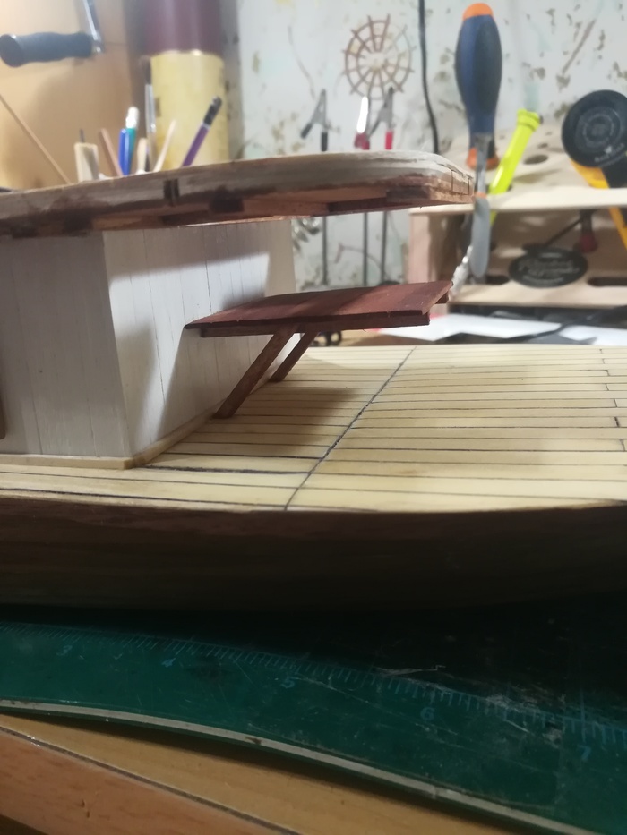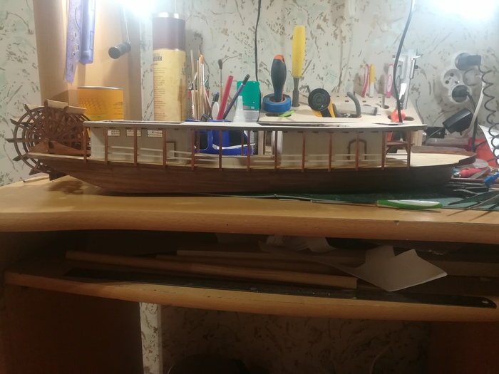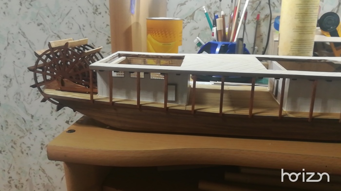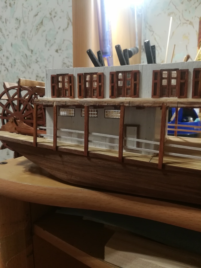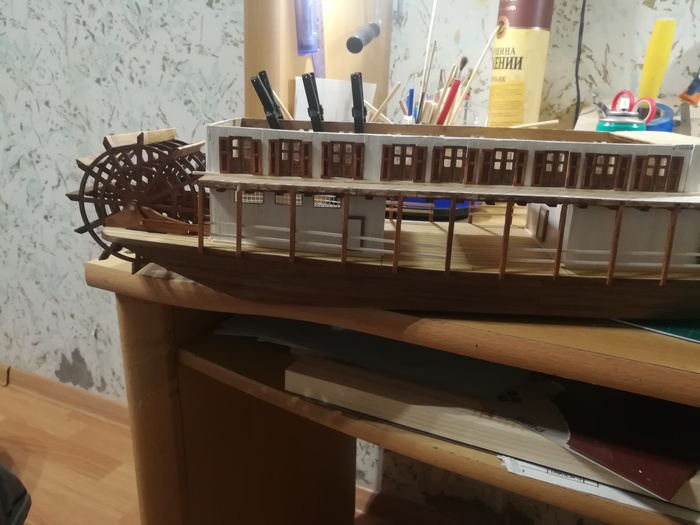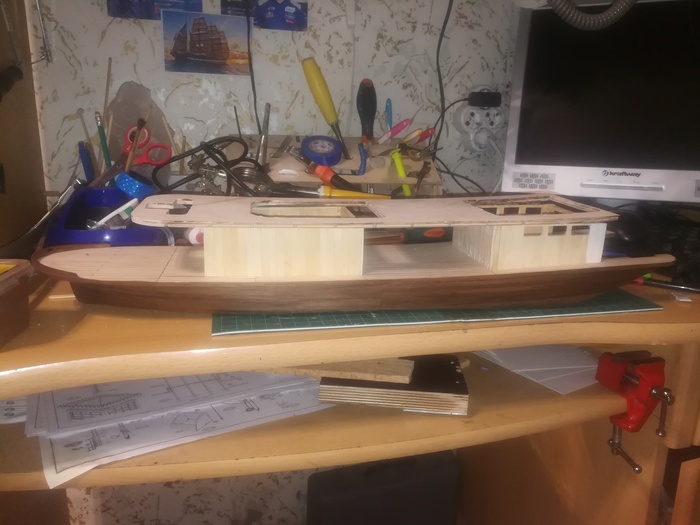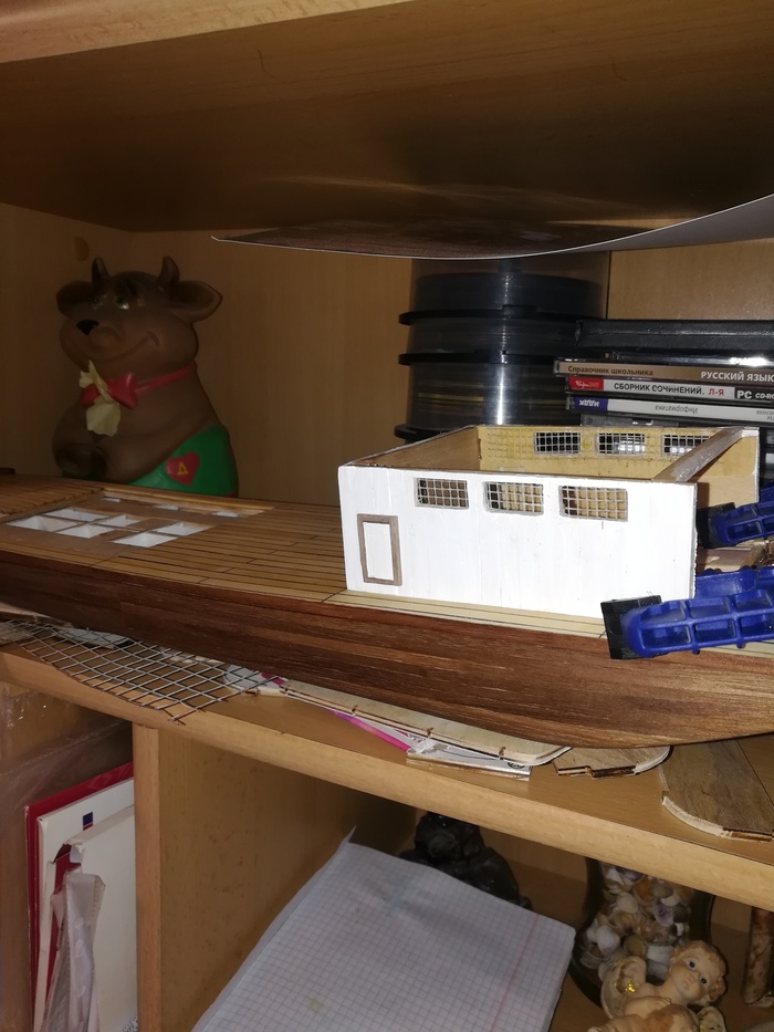 Были сделаны надстройки нижней палубы,склеены,обклеены и покрашены,так как решил все надстройки делать в белом цвете.Примеряны на свои места.