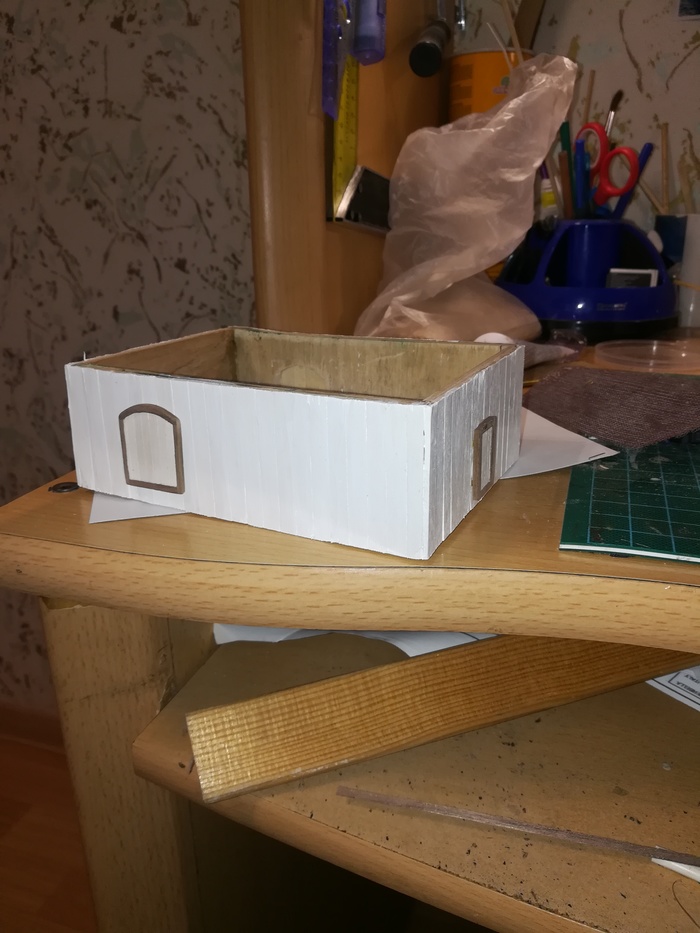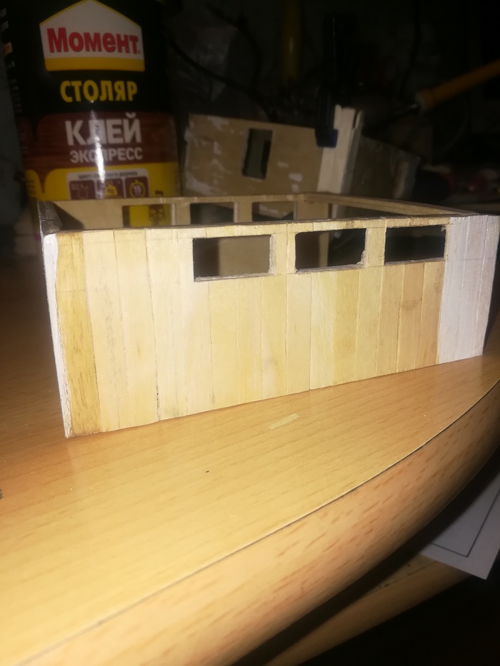 Начал обшивать черновой обшивкой,для неё использовал рейки липы толщиной 2мм, чтобы можно было сошкурить для выравнивания