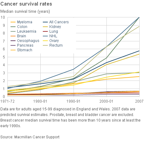 Число лет жизни среднего ракового больного после постановки диагноза за последние десятки лет выросло во много раз. Темно-синим цветом показана усредненная вероятность для всех видов рака / ©Macmillan Cancer Support