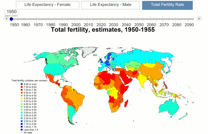 Хорошо видно, что рождаемость в мире падает и будет продолжать падать во всем обозримом будущем. Следовательно, вероятность заболеть раком будет расти, что и наблюдается на практике / ©Wikimedia Commons